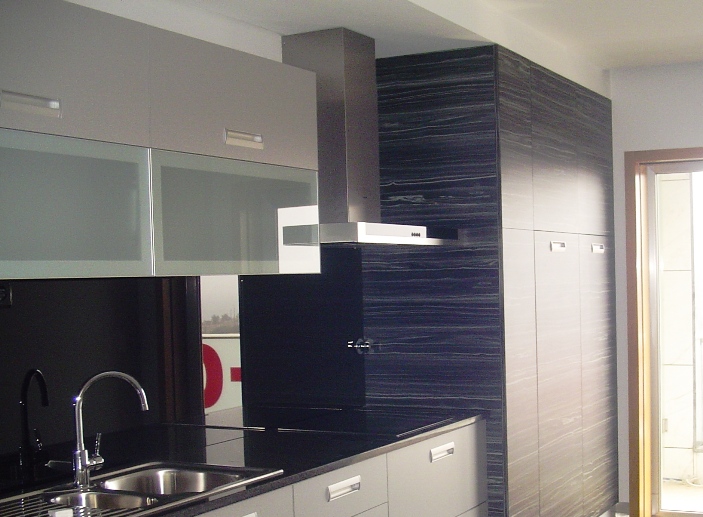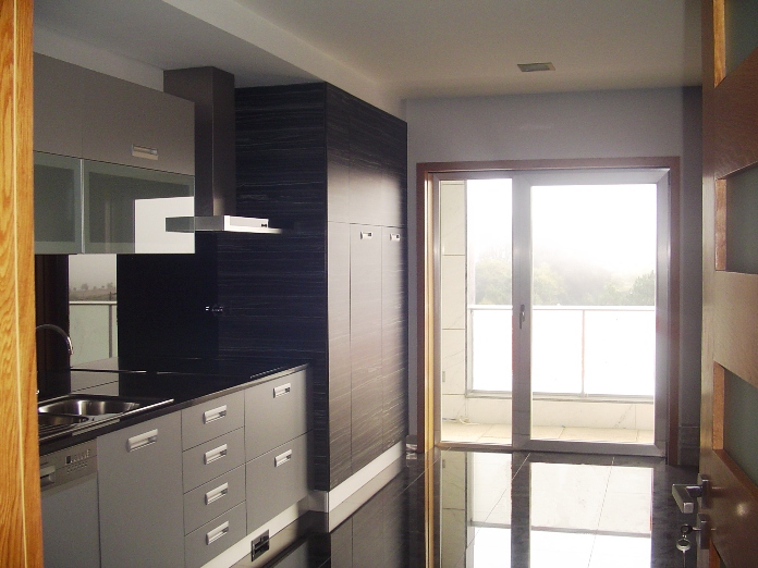 Toda a carpintaria é em madeira de carvalho com a ferragem e puxadores em aço inox.