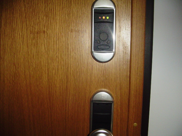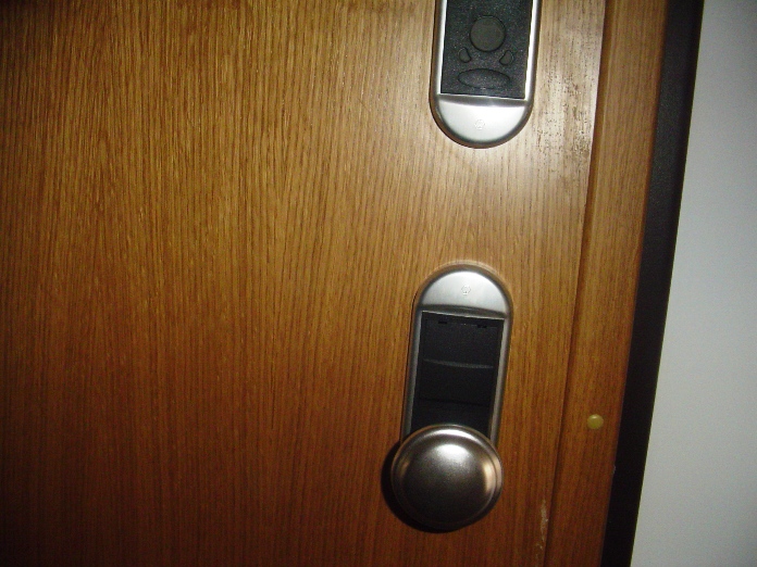 As portas são de segurança da marca dierre com fechadura electrónica de aproximação de cartão.