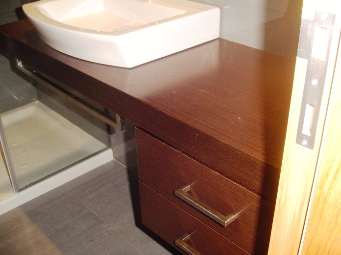 Os lavatórios serão apoiados em móveis MDF folheados a secupira ou similares.