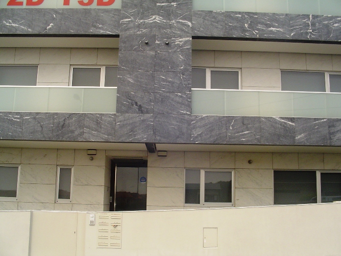 Os exteriores do prédio são revestidos em mármore grampiado e fachada ventilada.